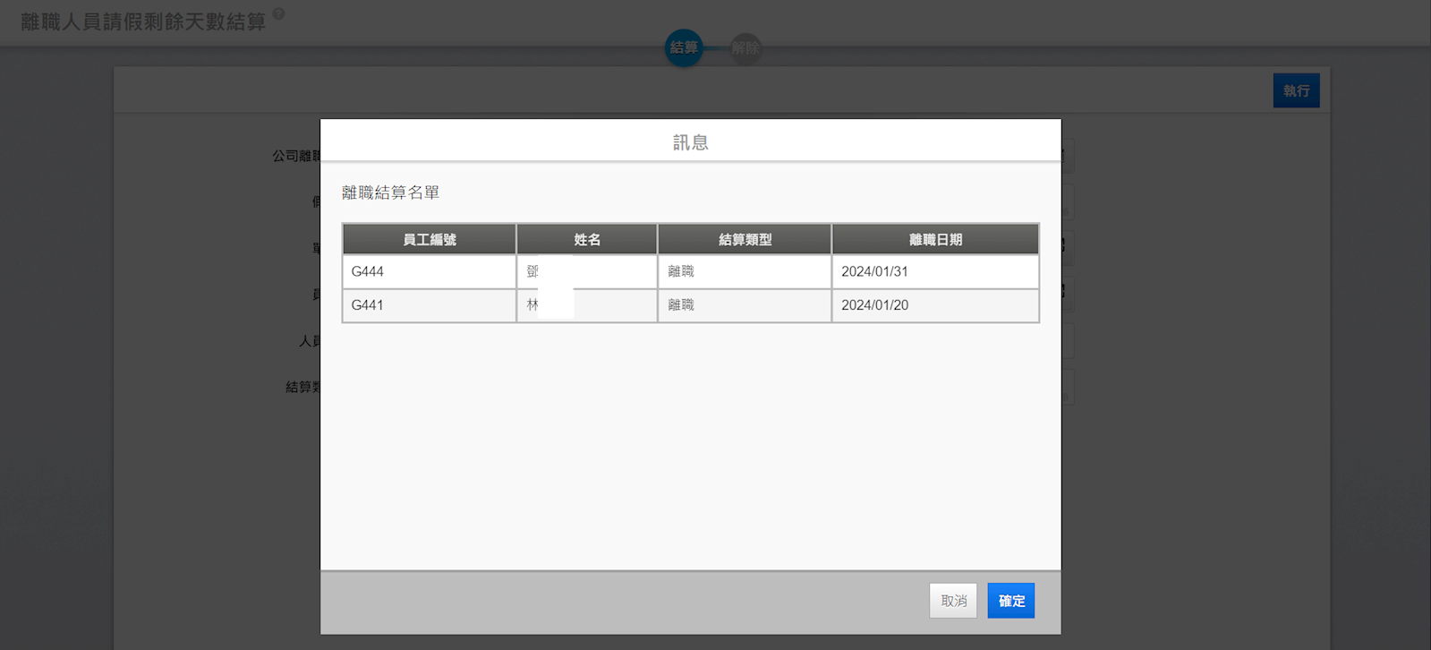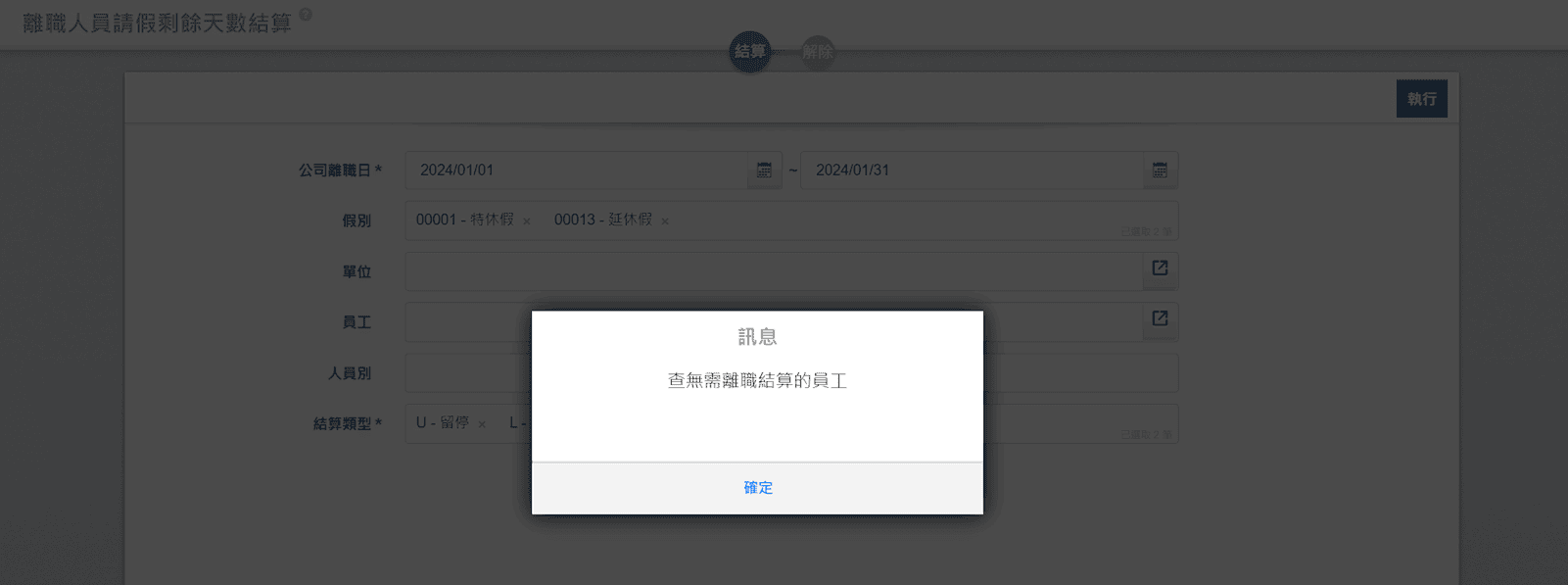 已執行離職休假結算過,則卡控無法再重覆執行。