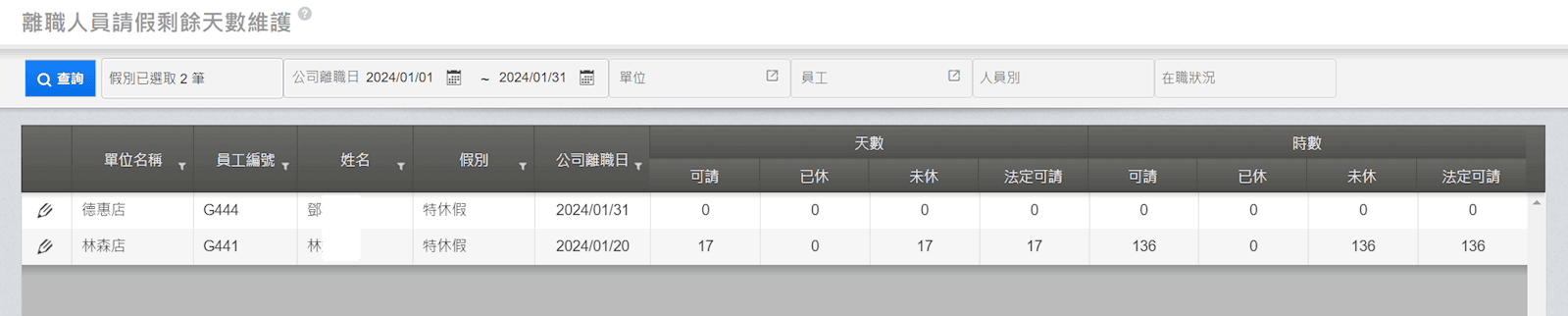 (3) 執行解除後,將一併刪除離職人員剩餘天數的資料,以及還原年度可休的結束日期。