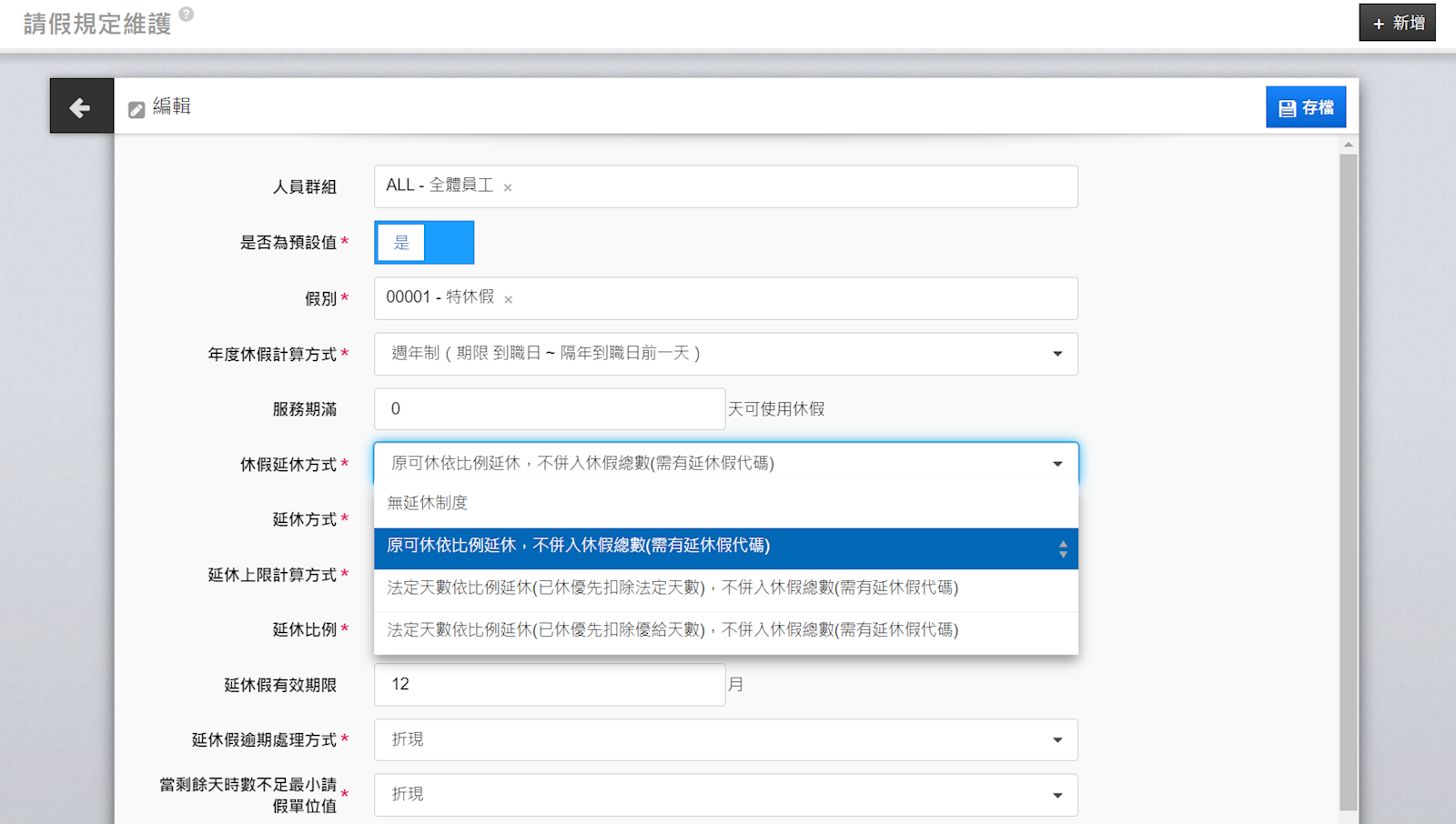 【請假規定維護】休假延休方式設定選項- 法定天數依比例延休(已休優先扣除法定天數),不併入休假總數(需有延休假代碼)