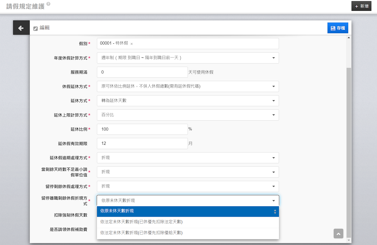 【請假規定維護】留停離職剩餘休假結算方式設定選項