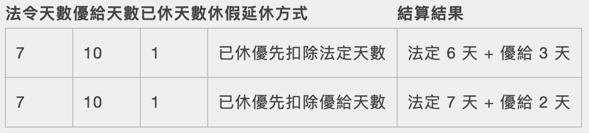- 法定天數依比例延休(已休優先扣除優給天數),不併入休假總數(需有延休假代碼)