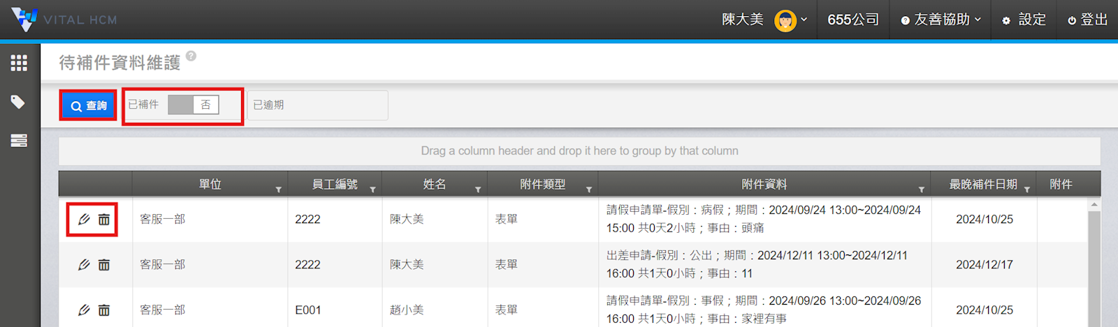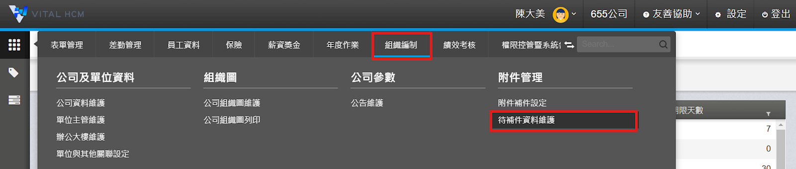 1. 若要修改或刪除待補件資料,請至【組織編制>待補件資料維護】。