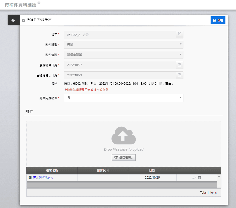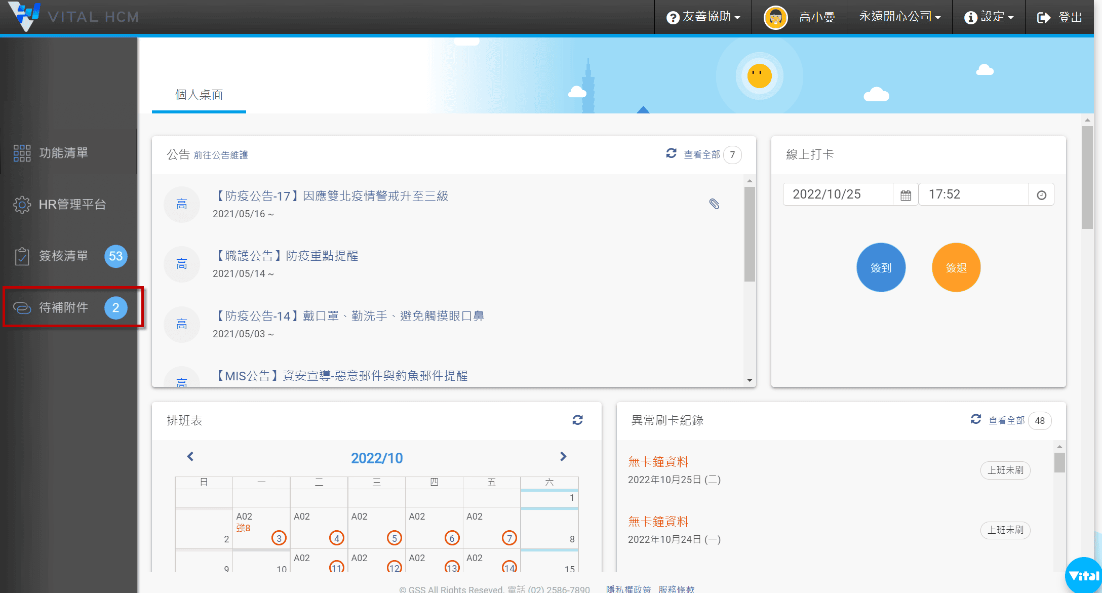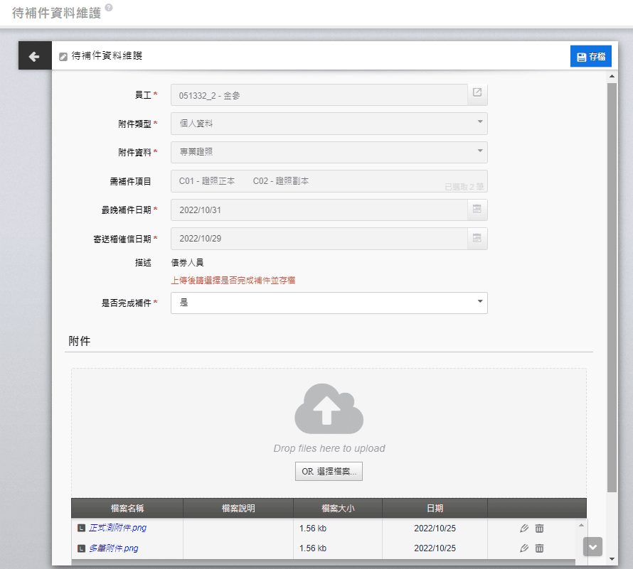 管理員完成待補附件設定(請見操作說明)後,員工首頁會出現【待補附件提醒】,請點選進入開始上傳補件。