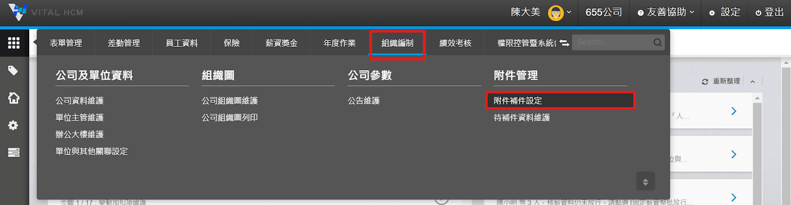 1. 請至【全站功能】>【組織編制>附件補件設定】。