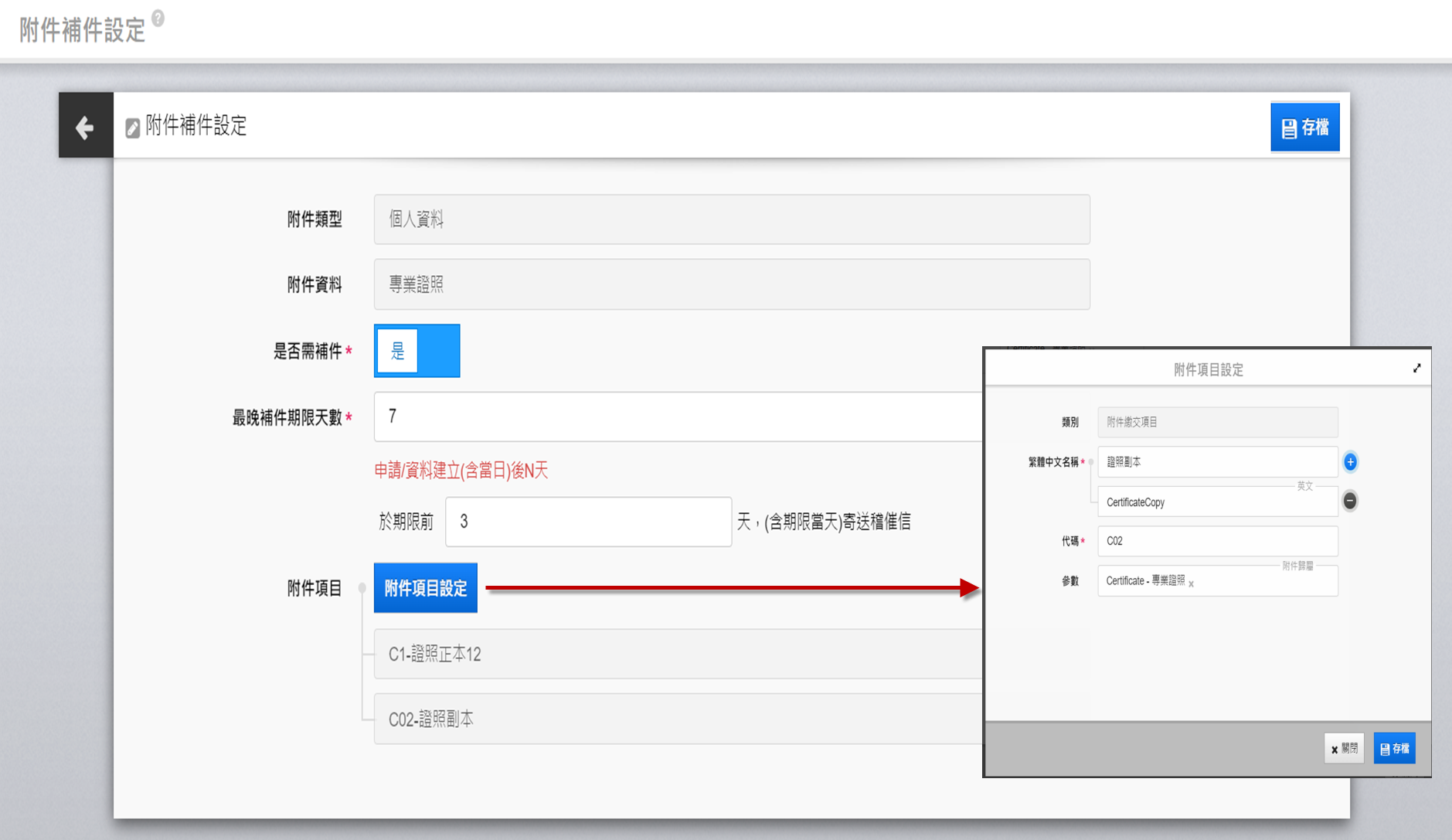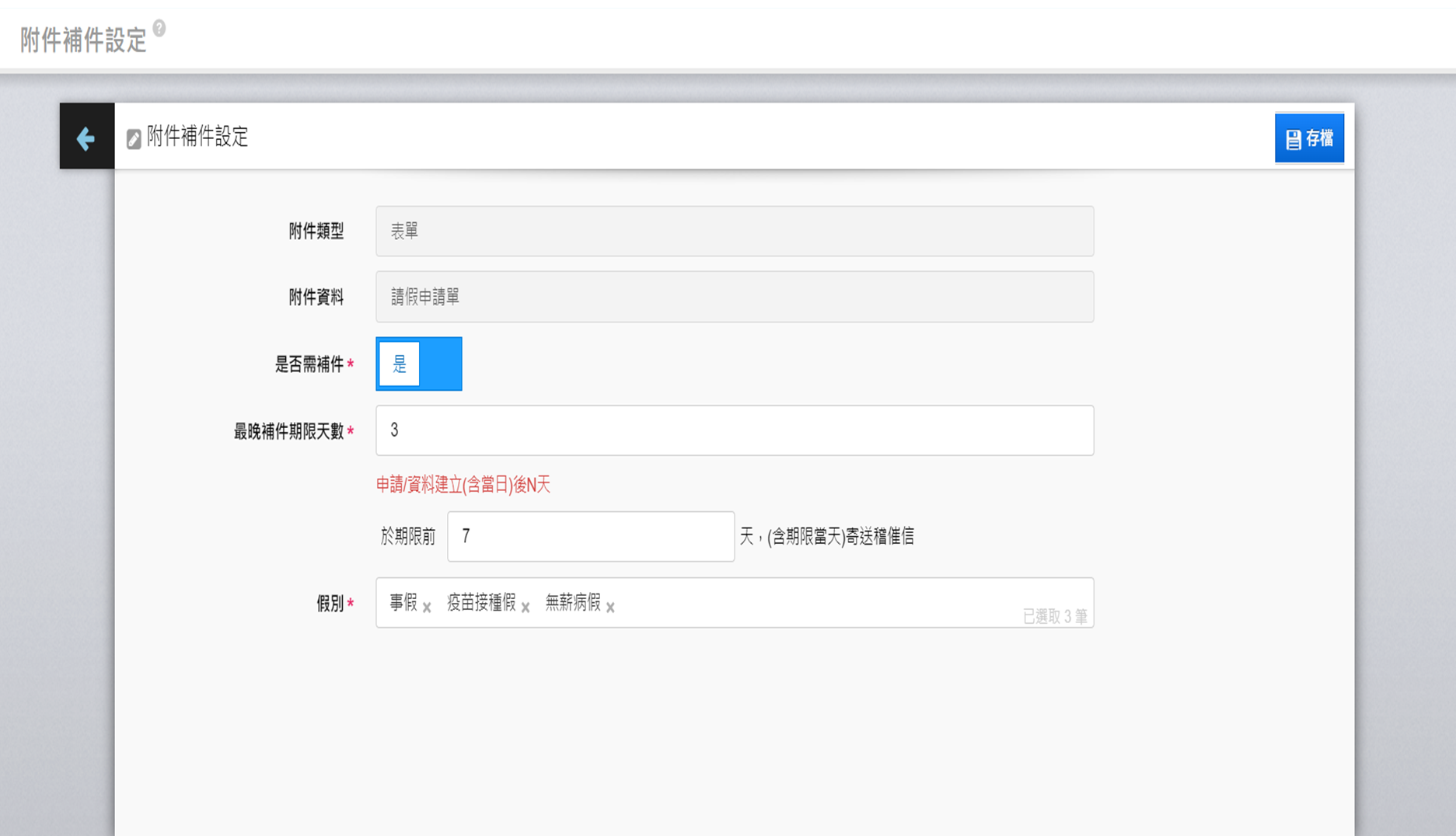 - 附件補件設定:可設定是否需要補附件及寄送稽催信的條件