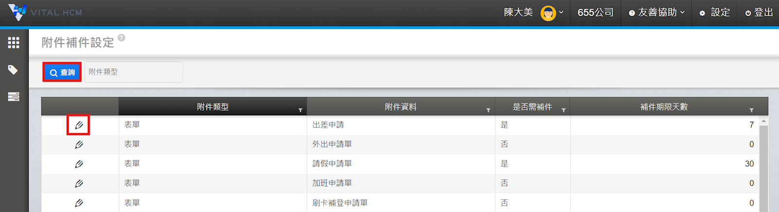 2. 點選【查詢】可看到所有附件補件設定,請點選鉛筆進入編輯。