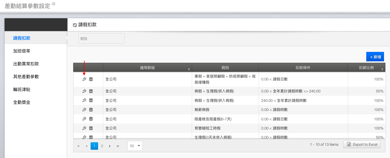 3. 差勤結算參數-請假扣薪:新增假別的扣薪規定