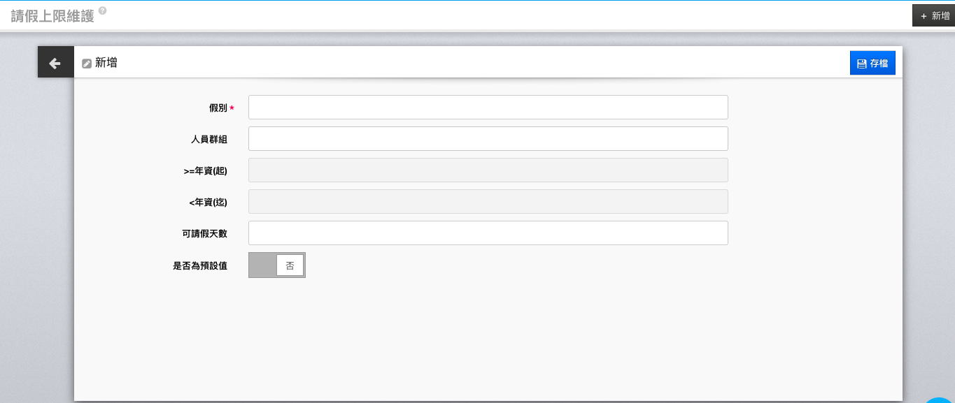 操作:頁面右上方點擊「新增」,選擇上一步驟所新增假別,並完成其他欄位(紅色*為必填)。若該假別的可請假天數無上限,請回到上一步驟的「假別設定」中,將「是否可超過可請時數」選擇為「是」,則「 可請假天數」即可隨意填寫數字,如 0~99