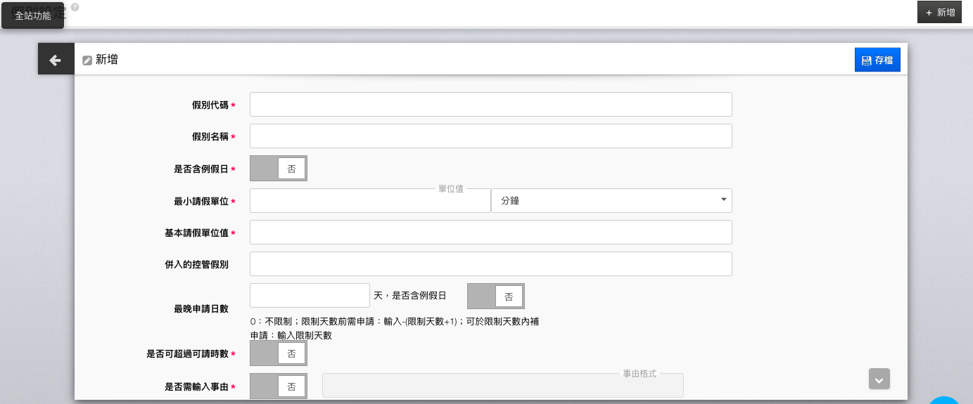 操作:頁面右上方點擊「新增」,開始建立假別(紅色*為必填)