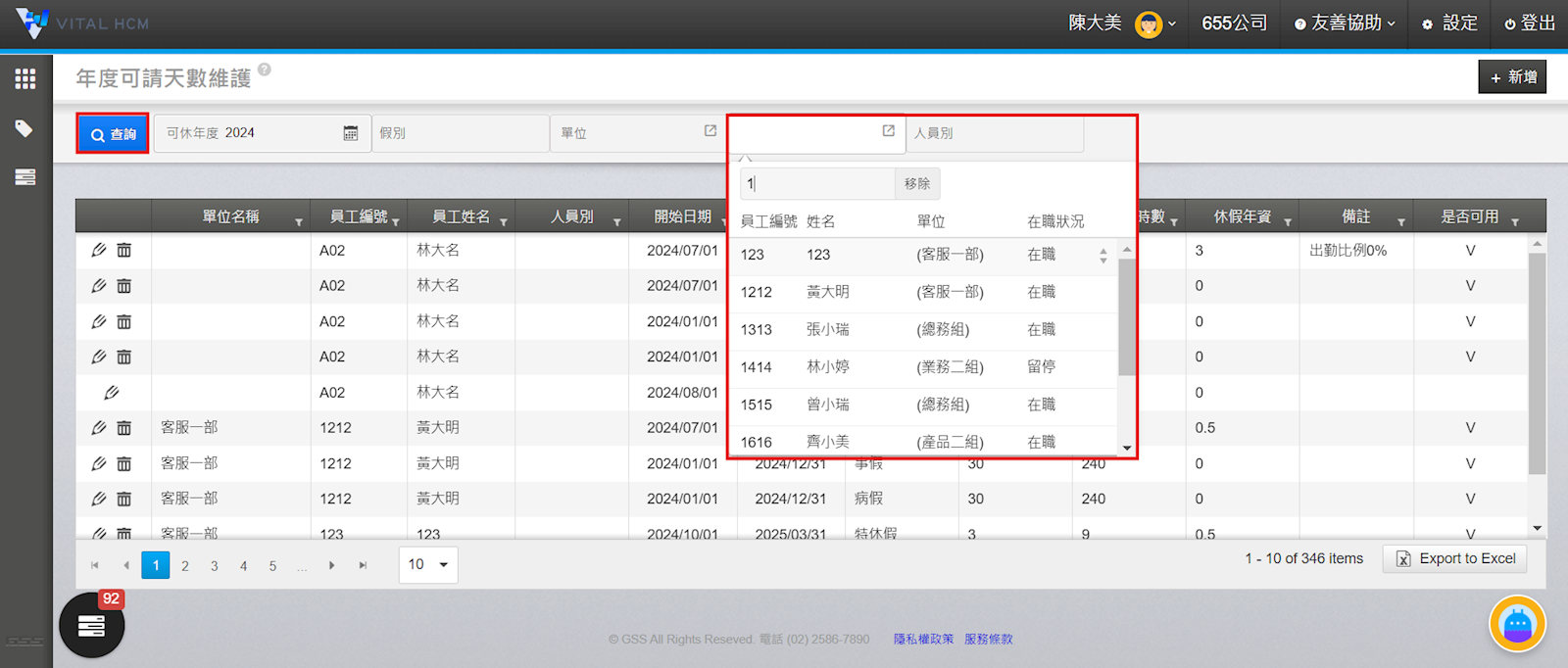 2. 按【查詢】可查看所有員工的假別資料,或輸入員工編號搜尋要調整假別的員工資料。