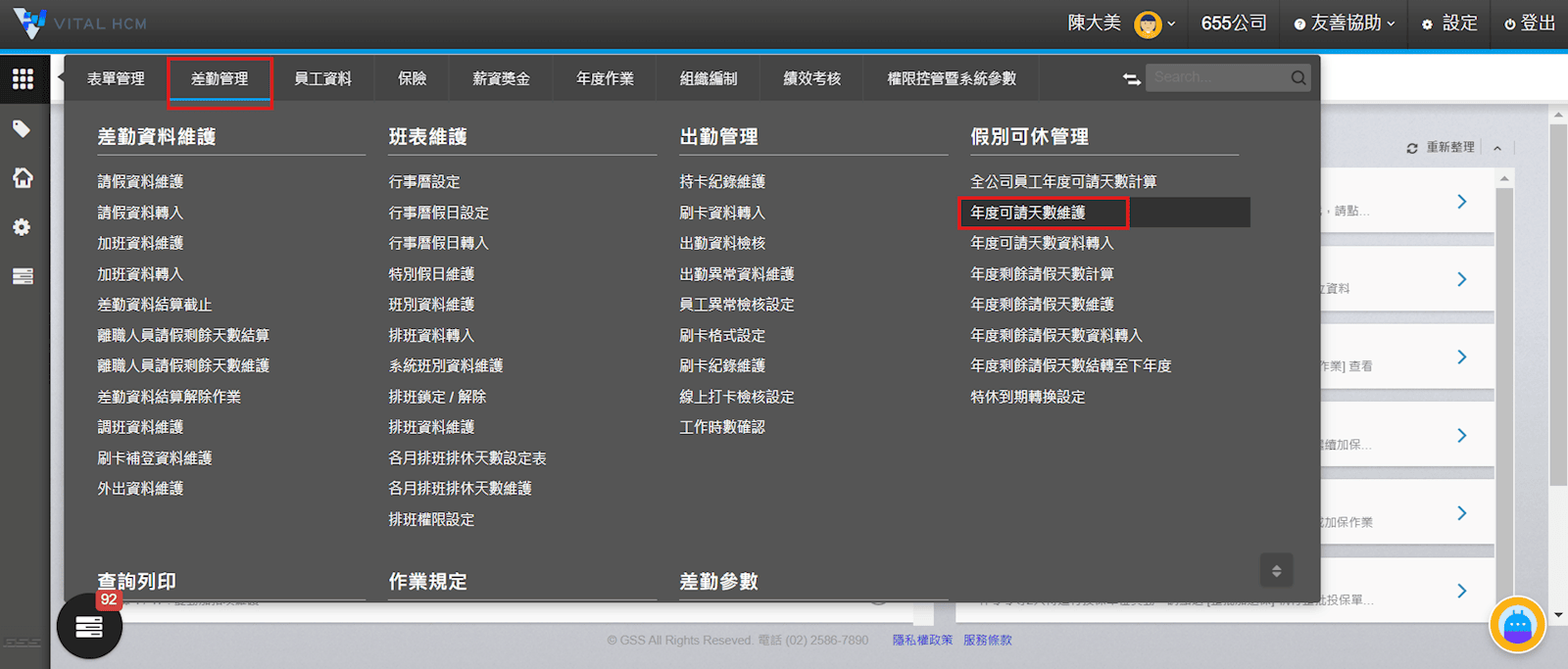 1. 請至全站功能的【差勤管理】>【假別可休管理>年度可請天數維護】。