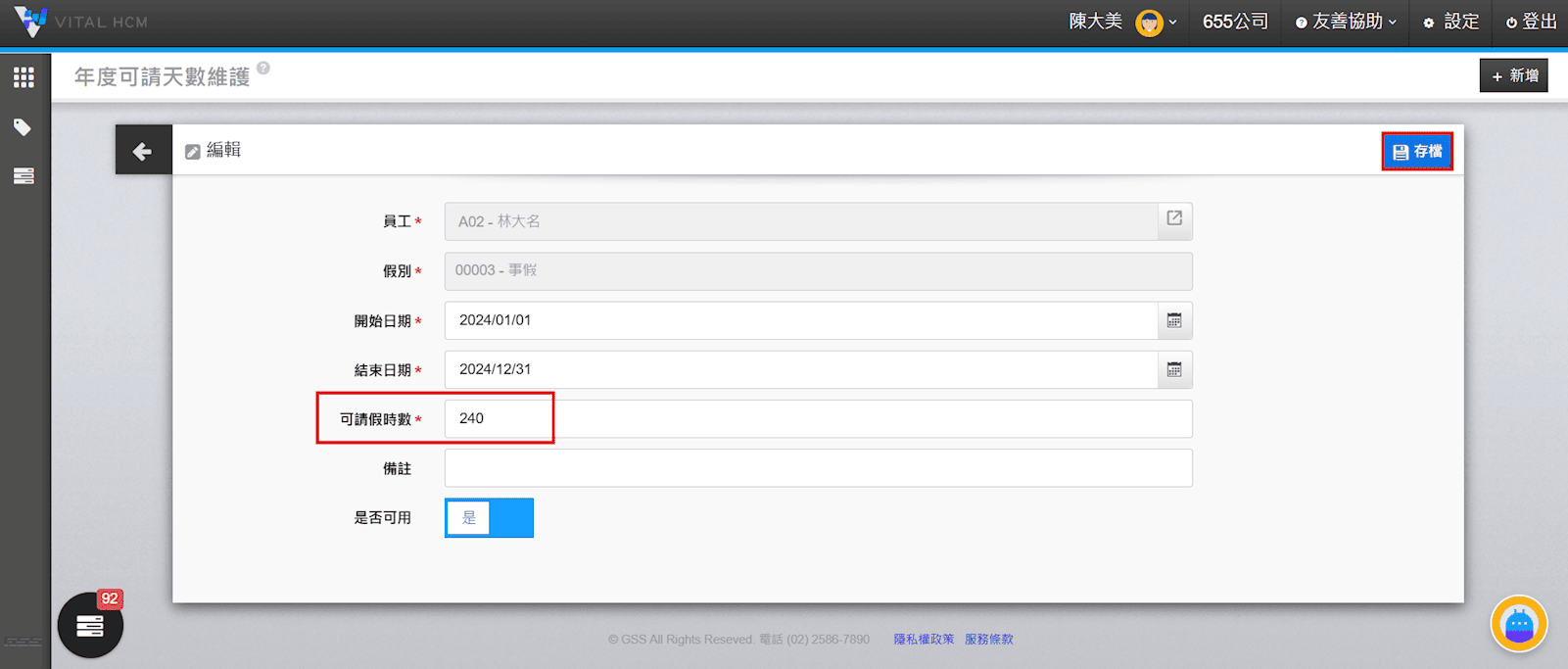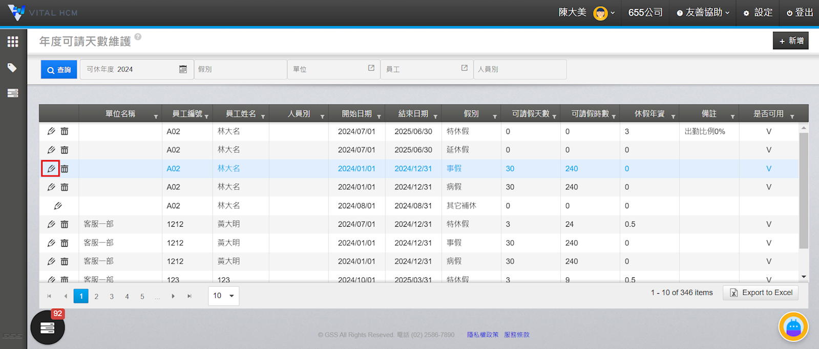 3. 選擇要調整天數的員工後按左邊鉛筆進入編輯。
