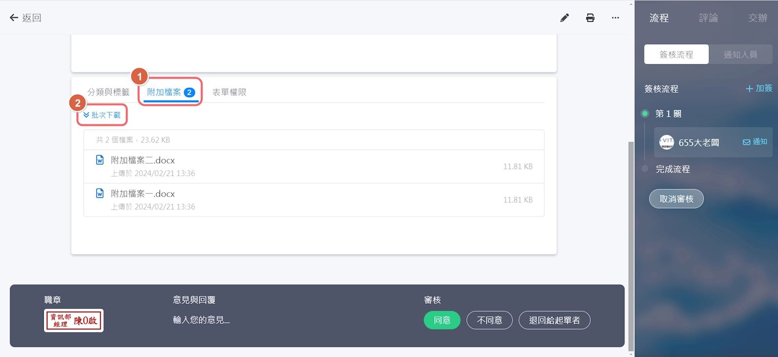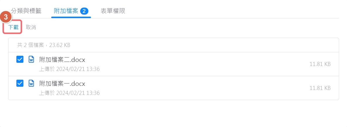 點擊表單下方的【附加檔案】按鈕,接著點擊【批次下載 > 下載】,就可以一次下載所有附加檔案。