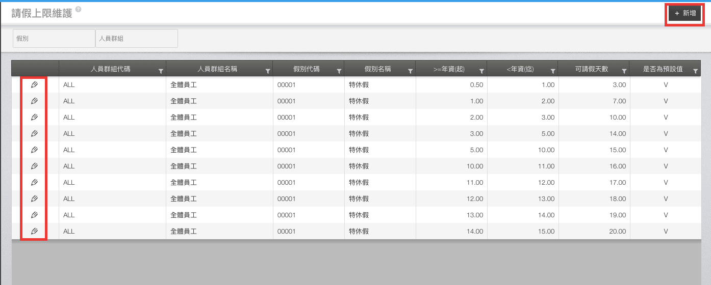 您可以點擊右上角的「新增」,新增一個新的請假上限;或是可以點擊「鉛筆圖示」修改已建立的請假上限。