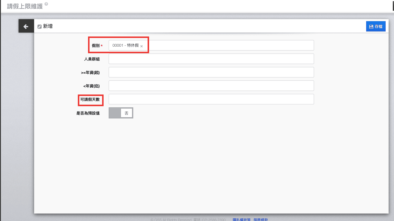 首先,將「假別」選為「特休假」,接著可以設定人員群組、年資,最後請輸入「可請假天數」。資訊輸入完畢,點選右上角「存檔」即可。