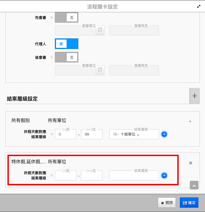 畫面中會出現剛剛新增的設定,接著,請輸入休假的開始和截止天數,並選擇簽核的結案層級。輸入完畢,點選右下角「確定」即完成表單簽核層級的設定。