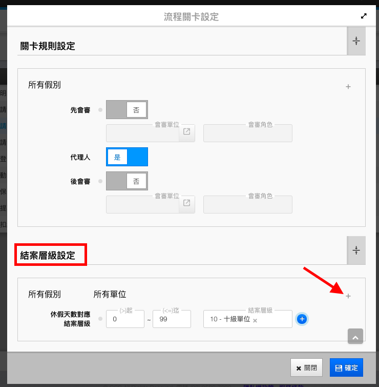在流程關卡設定的下方,有【結案層級設定】,系統預設為「所有單位」的結案層級為「十級單位」,您可以點選右上方的+,新增結案層級設定。