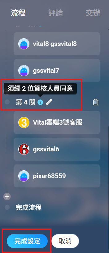 5. 點擊加簽關卡旁邊【鉛筆】可編輯人員,游標移至【i】可查看過關條件,檢查無誤後請點選【完成設定】。