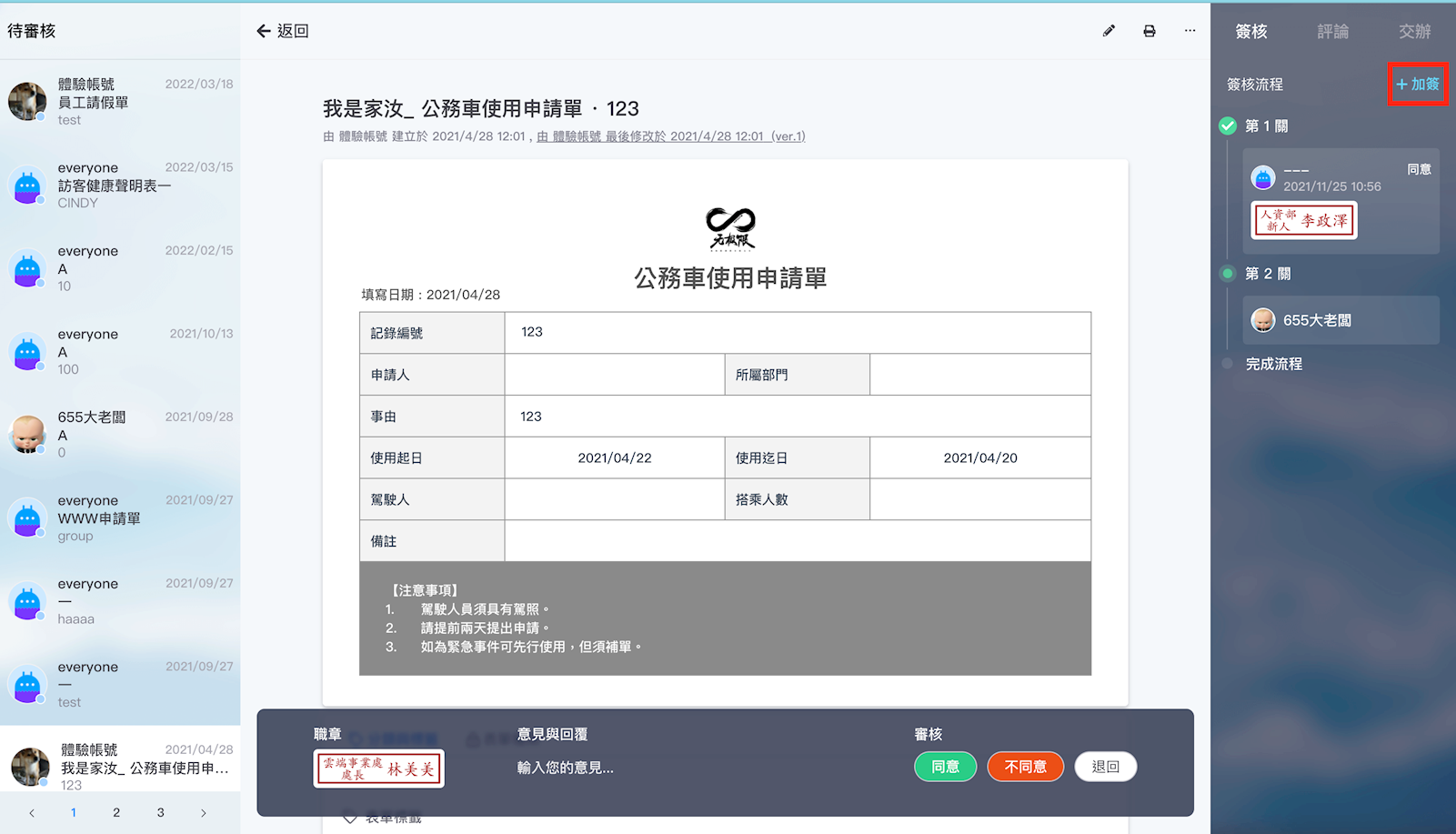 1. 點擊進入尚未簽核完成的文件後,右方的簽核視窗中可以點選「加簽」。