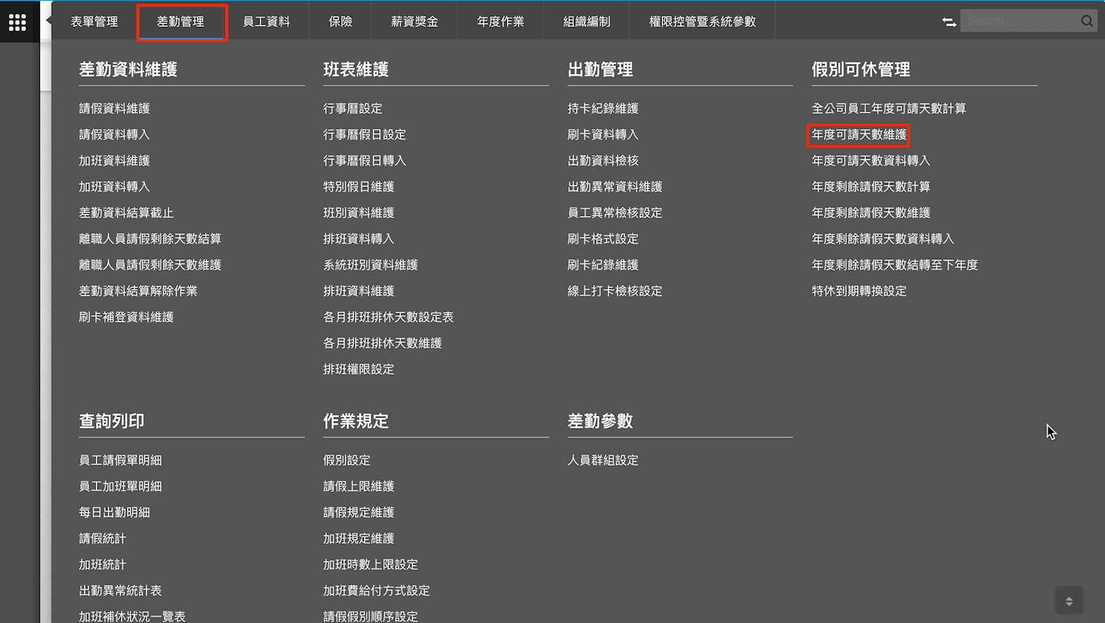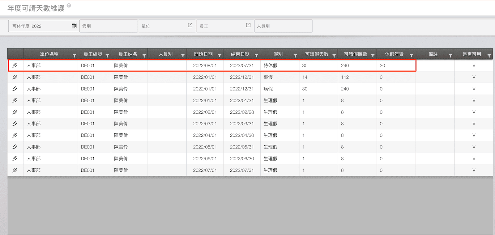 5. 可以至【差勤管理>假別可休管理>年度可請天數維護】查看各員工的可請天數。