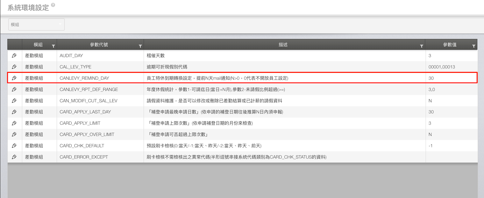 點擊「特休到期轉換設定,提前N天mail通知」的鉛筆圖示進行修改,預設值為 30,也就是特休到期前 30 天會發信提醒同仁。