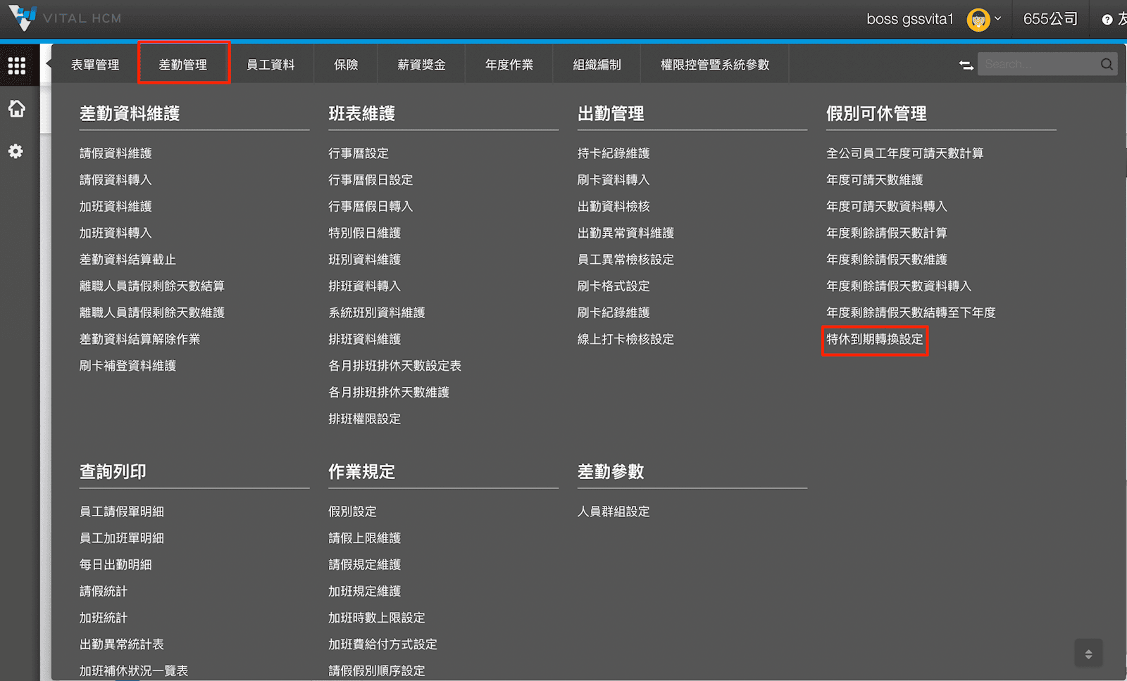 6. 當員工收到系統 mail 到期通知信,可以至【差勤管理>假別可休管理>特休到期轉換設定】。