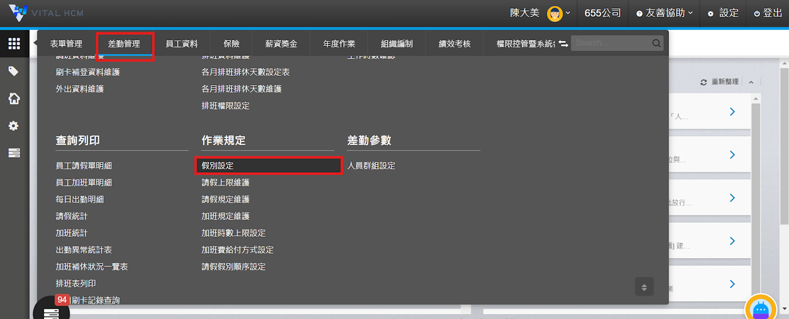 1. 請至【全站功能】>【差勤管理>作業規定>假別設定】。