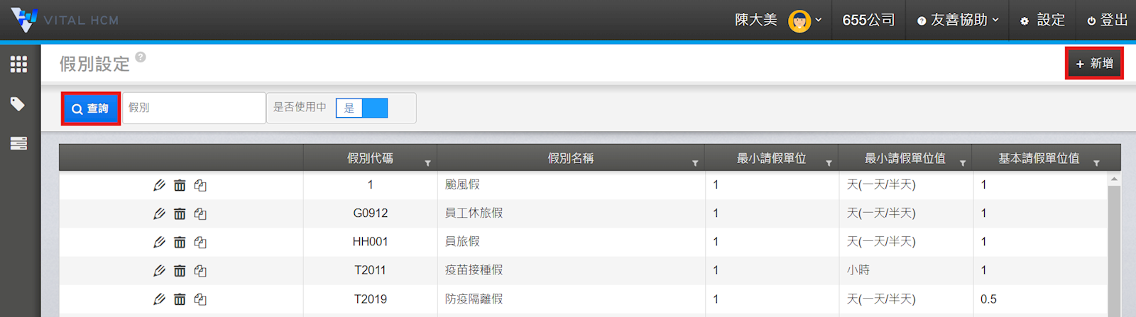 2. 點選【查詢】可看到目前所有假別;點選鉛筆可進入編輯;點選右上角【新增】可新增假別。