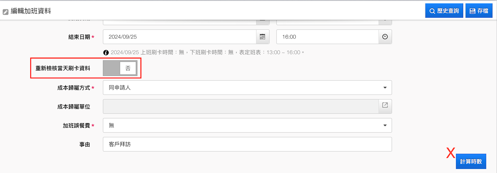 接著會回到編輯加班資料的畫面,請將「重新檢核當天刷卡資料」改為「否」,然後直接點「存檔」即可。