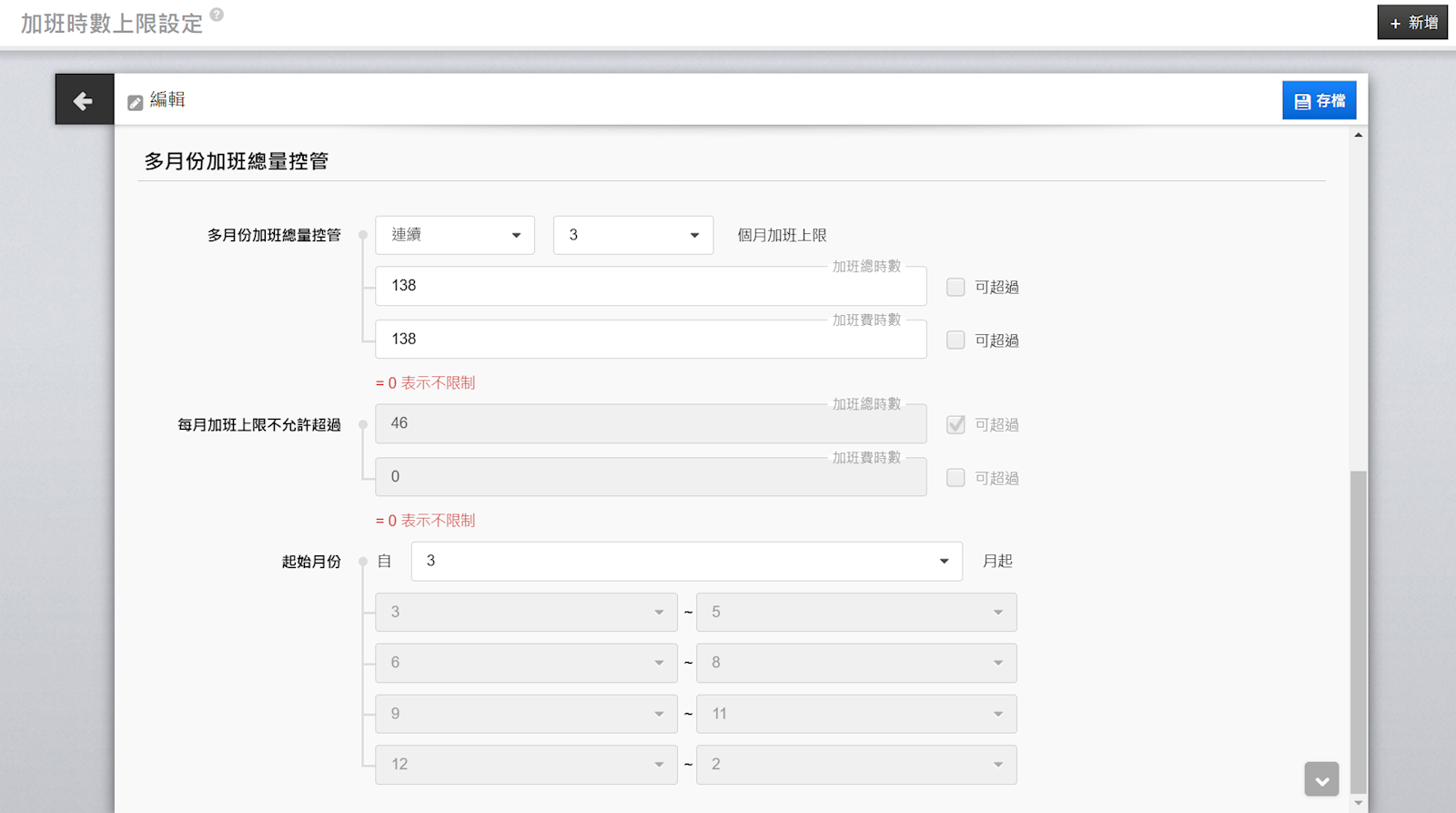 1. 【加班時數上限設定】的「多月分總量控管」,可依照啟用區間設定
