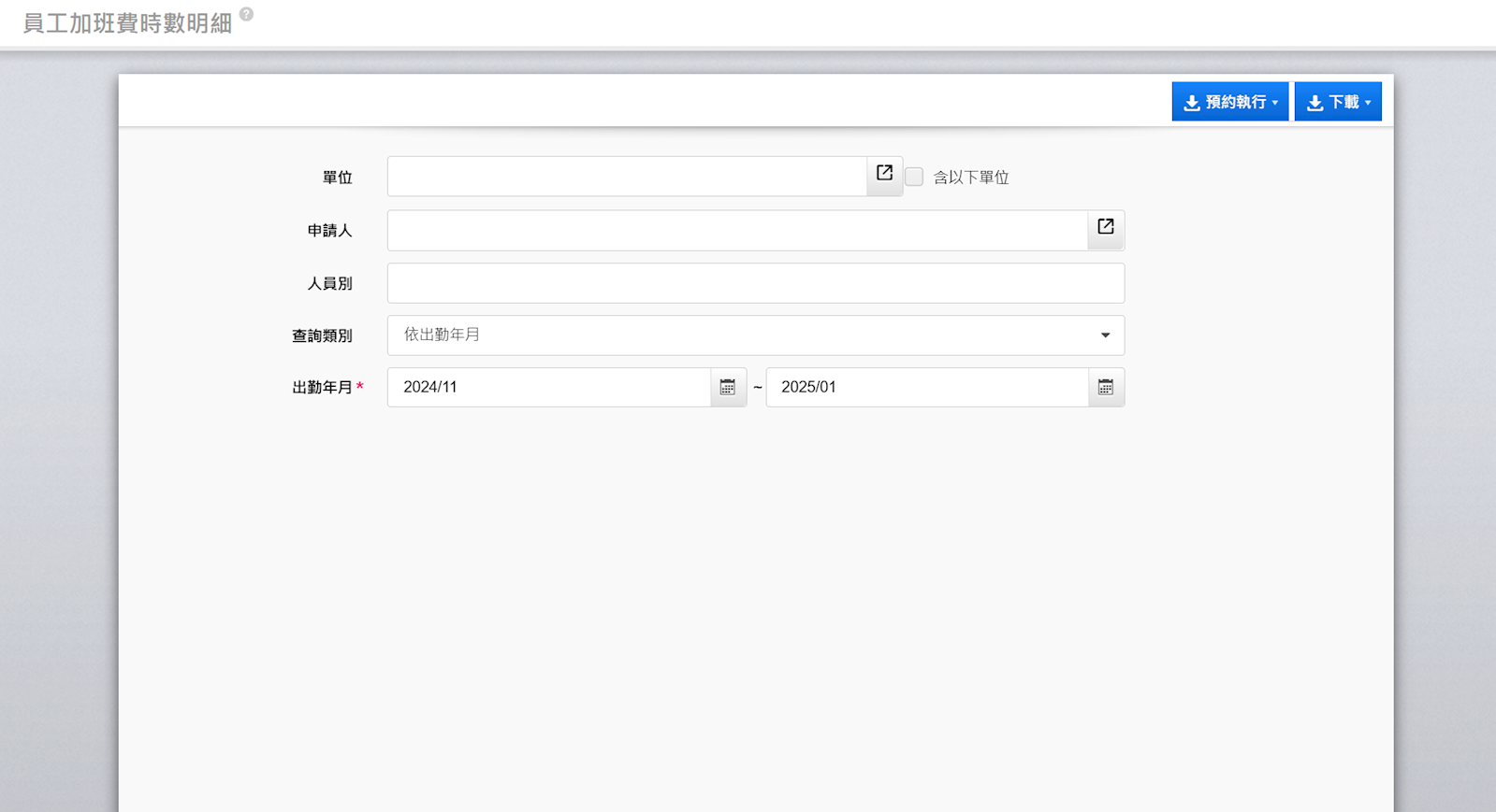 3. 【員工加班費時數明細】查詢類別欄位,可依據發薪狀況/出勤年月查詢
