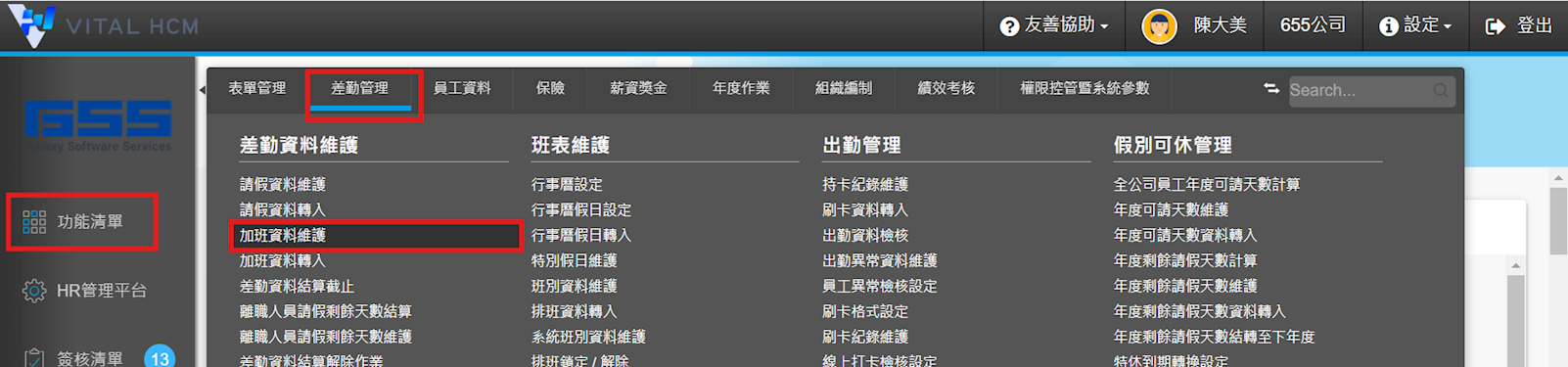 1. 請至【功能清單】>【差勤管理>加班資料維護】。