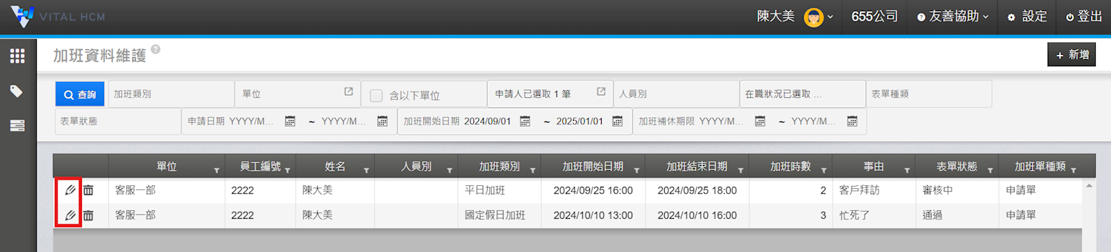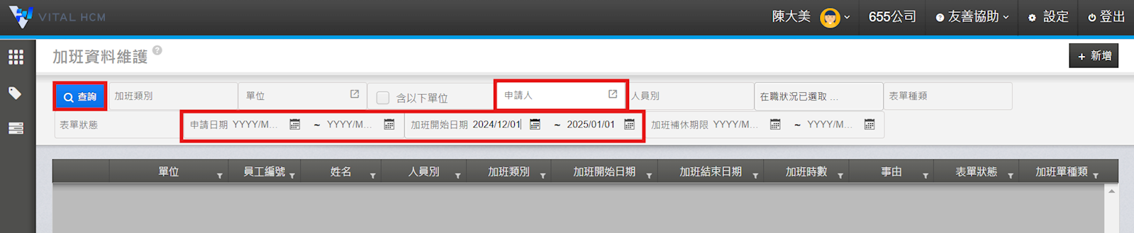 2. 您可輸入加班申請人、申請日期、實際加班日期後, 按【查詢】即可看到歷史申請的加班資料。