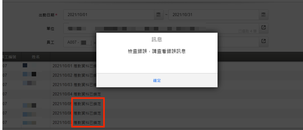 在出勤資料檢核時,出現錯誤訊息,顯示「差勤資料已鎖定」。