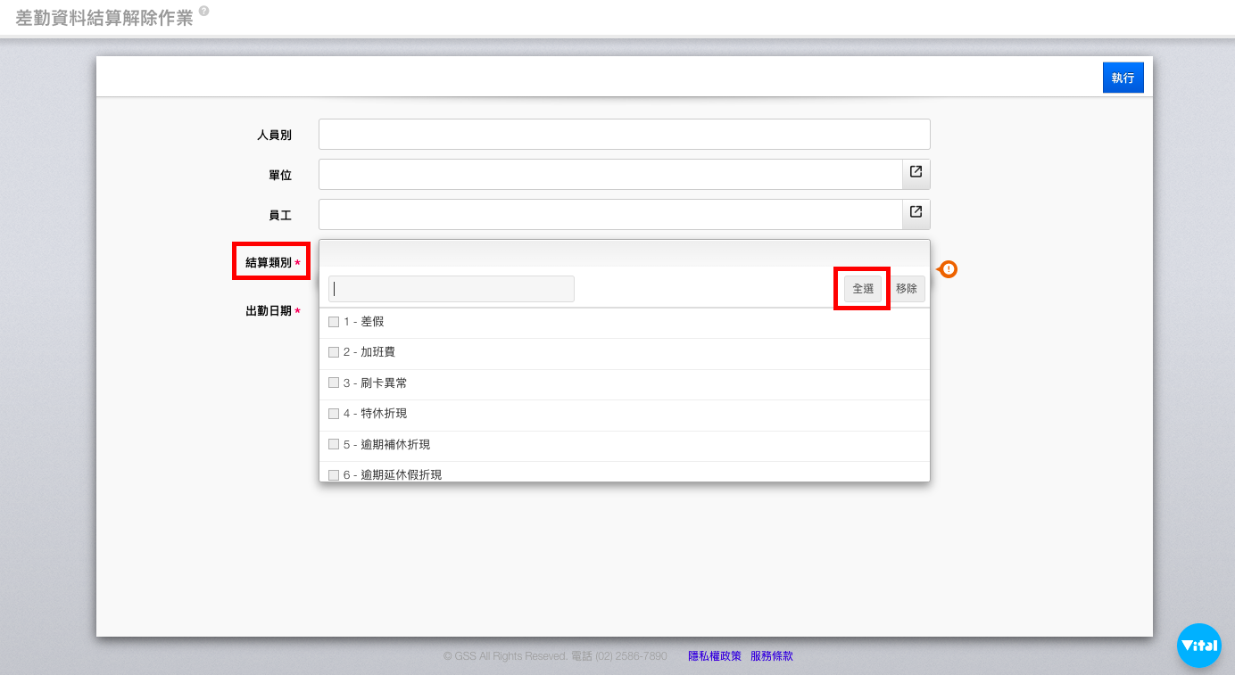 發生此情況時,請您在【差勤管理>差勤資料結算解除作業】中,「全選」結算類別,因為像是加班時數、請假時數等資料,都會影響到差勤資料檢核的結果,把鎖定的資料打開後再重跑一次即可。