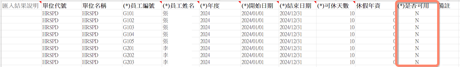 其他自訂新增的假別,若可休結束日期到期時,可透過下載範本調整[是否可用]為 N,再上傳更新,避免員工繼續使用。