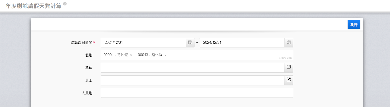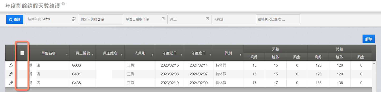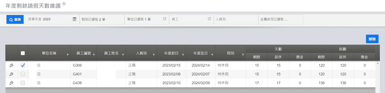 - 年度剩餘請假天數維護,需要重新結算時,請執行[解除],可直接還原年度可休為可用狀態,並刪除剩餘天數的資料,再重新執行結算。