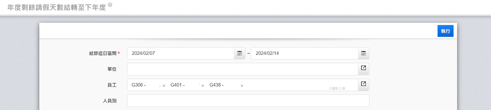 【年度剩餘請假天數結轉至下年度】若已結轉則年度剩餘請假資料不可再更動,原年度可休為不可用的狀態。