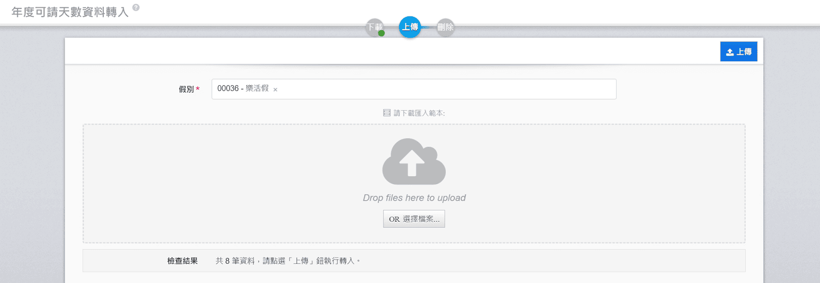 - 其他自訂的假別可休到期時,可下載範本再上傳,回押年度可休為不可用的狀態。
