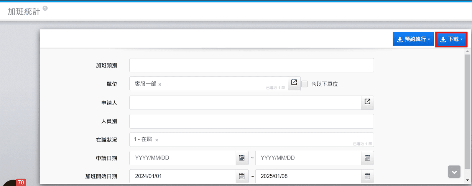 【加班開始日期】:預設值為系統日前七天~系統當日的日期,也可以自行設定,設定完後點選【下載】可下載 excel。