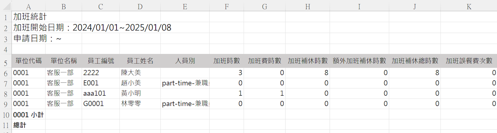 顯示【加班時數】、【加班費時數】、【加班補休時數】、【額外加班補休時數】、【加班補休總時數】,依員工加總。