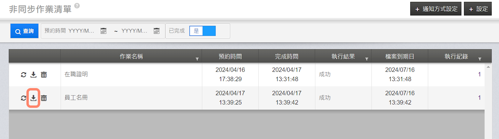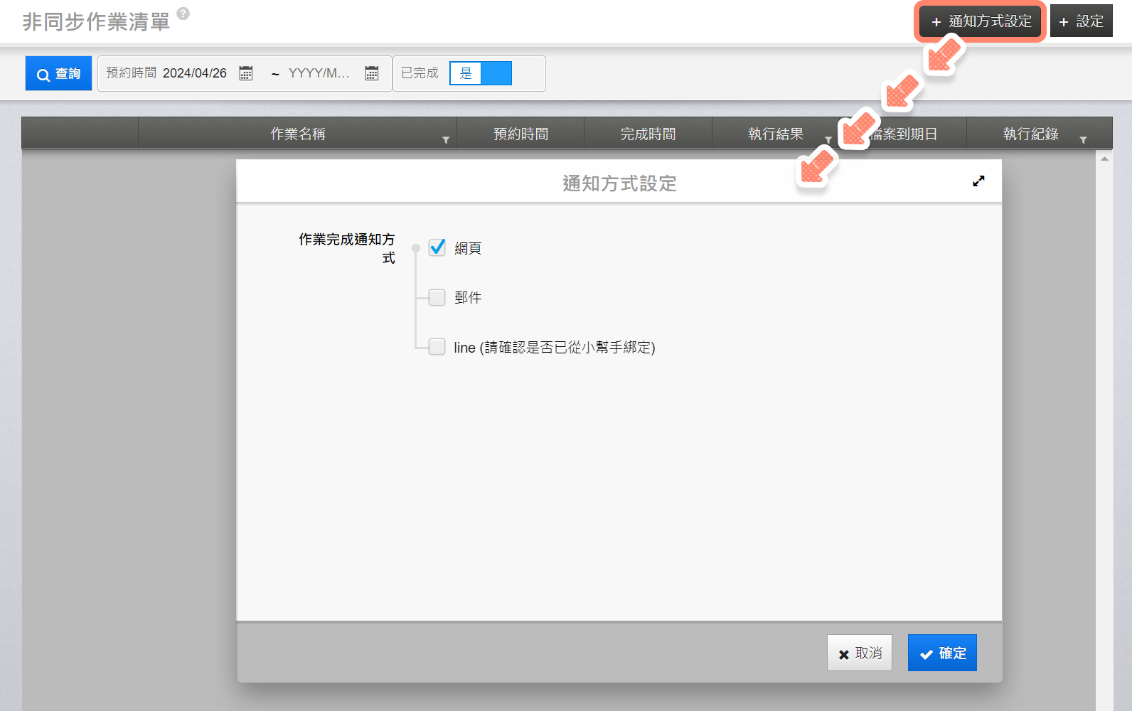 - 【非同步作業清單】可設定通知方式及檔案保留期限。