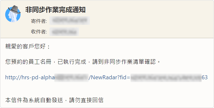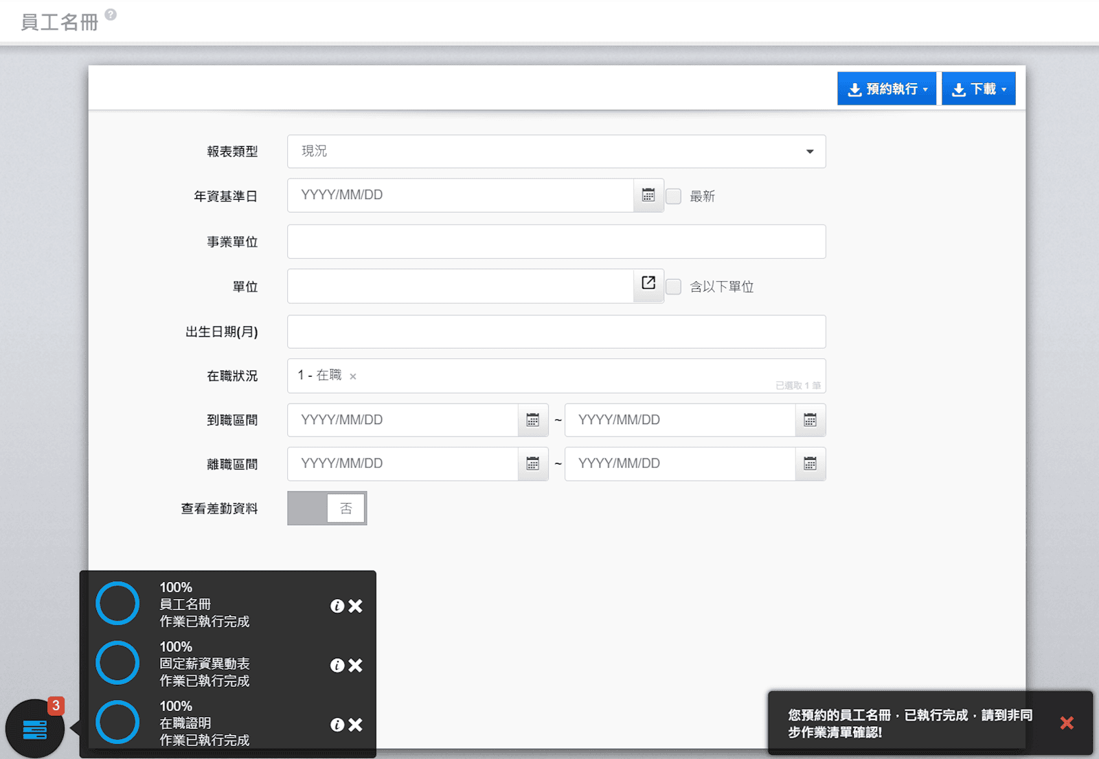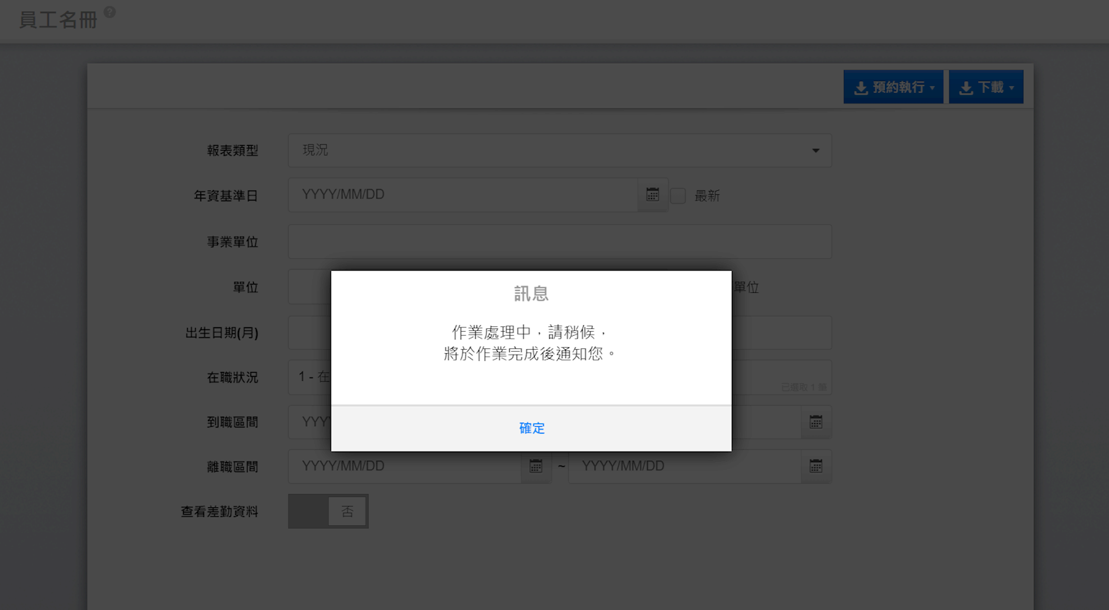 情境:避免 HR 在產生報表時,需要在線上等待,無法使用其他功能,故改採背景產生報表的方式,讓人資伙伴可以更靈活運用系統,減少等待時間;另外也可以預約執行產生報表的時間,於報表產生完成時,可以透過網頁訊息、郵件、LINE 等方式通知。