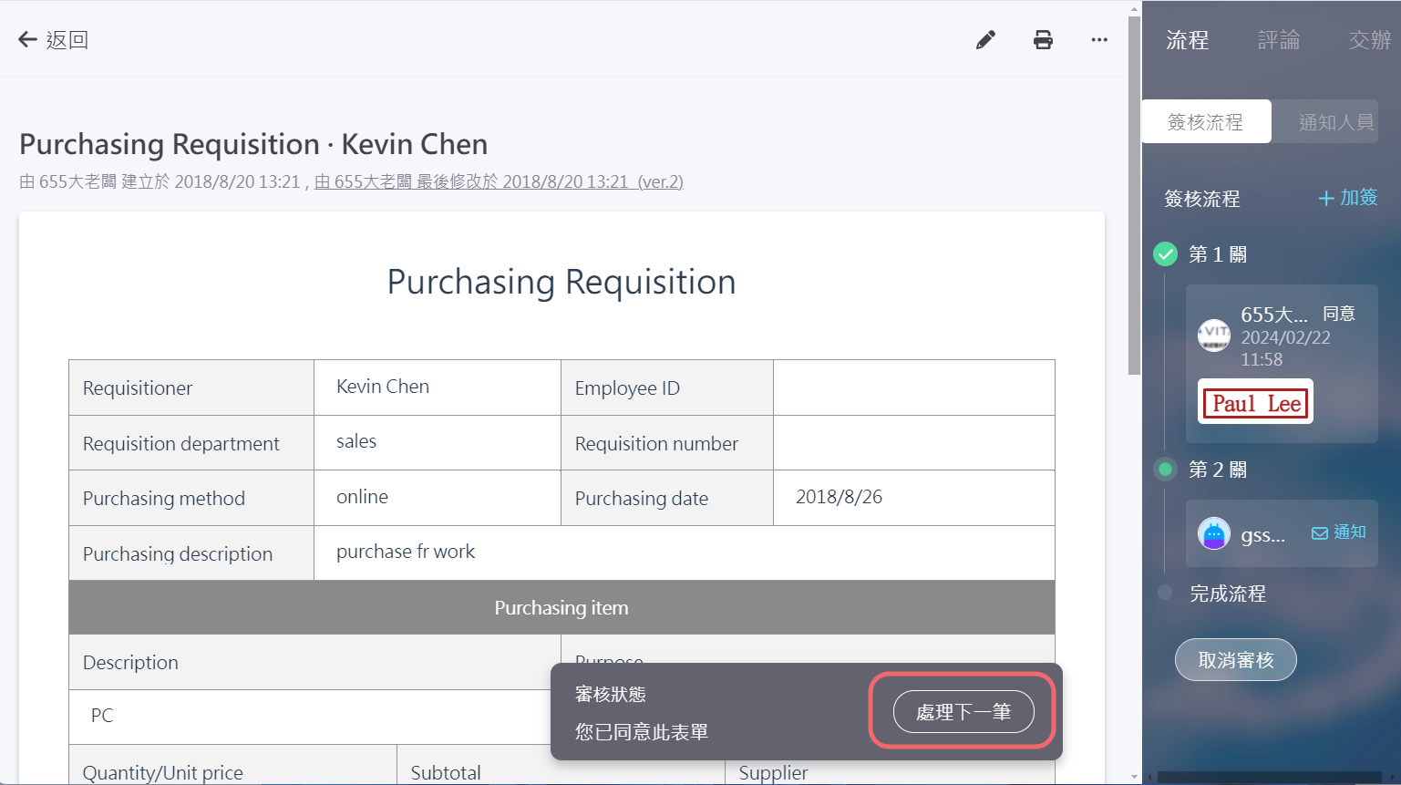 審核完成後,系統將會直接顯示「下一筆」按鈕,只需點擊就可以快速切換到下一筆待審核的表單。