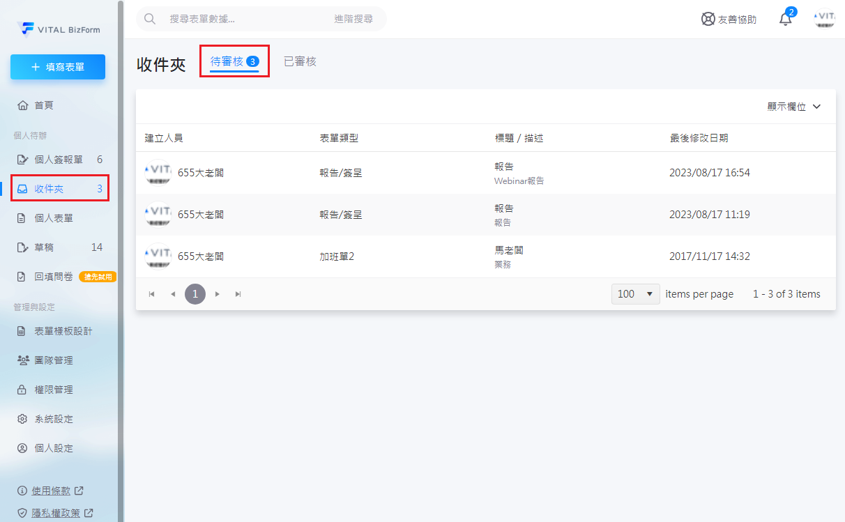 在首頁左方點選【收件夾】,點擊【待審核】頁籤 (會顯示待審核文件數),【建立人員】欄位可查看是哪位同仁填寫的表單。