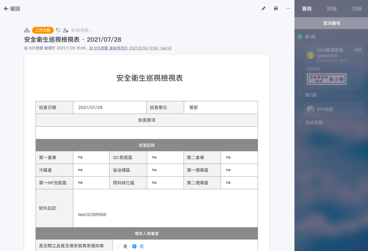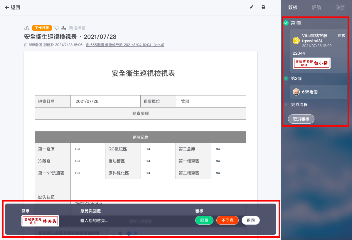 點入欲審核得表單後,表單最下方可以輸入意見與回覆(非必填),並選擇審核是「通過、不通過、退回」,點選完畢,即完成審核動作。右方會顯示簽核關卡,您無法修改或刪除審核表單,只可以「取消審核」。
