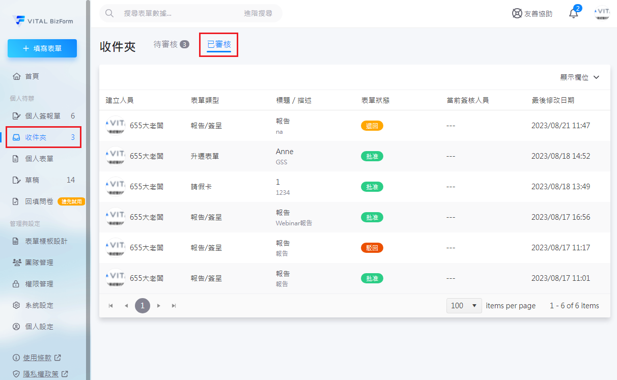 審核完畢,回到首頁點選左方的【收件夾】,點擊【已審核】頁籤,即可檢視已審核的文件。