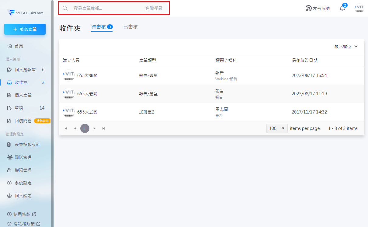 您也可以直接在上方的搜尋欄中,輸入欲審核的表單關鍵字。查詢表單。