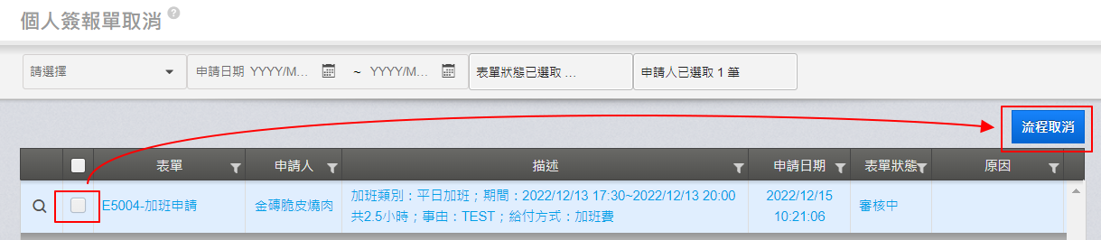 【個人簽報單取消】可以看到自己送出的表單,預設會看到狀態還在審核中的表單,勾選要取消的表單後,點右邊的流程取消。