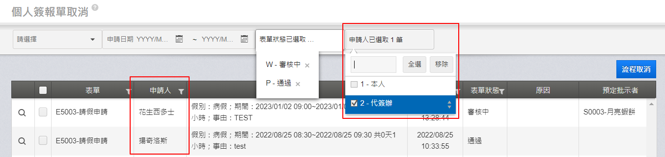代申請者也可以取消幫別人填寫送出的表單,”申請人”篩選代簽辦,就會看到自己幫其他人申請的表單,一樣可以勾選表單點右上角"流程取消"將它撤回。